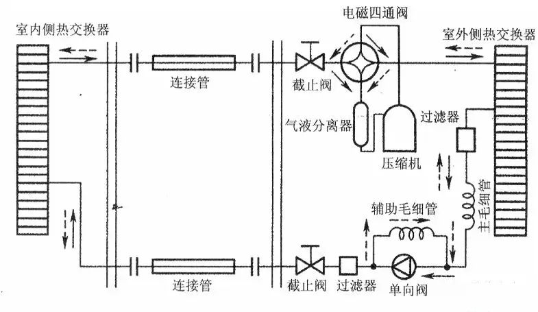 3、 熱泵系統(tǒng) 。與單冷系統(tǒng)情況相同,熱泵運(yùn)行是否正常,主要檢查四通換向閥的工作情況。換向閥換向時(shí),可聽(tīng)到有比較響的氣體流動(dòng)聲以及電磁閥頂針的撞擊聲(電磁場(chǎng)吸動(dòng)閥心),當(dāng)電磁閥在換向過(guò)程中聽(tīng)不到上述兩種聲音,那電磁閥可能出故障。