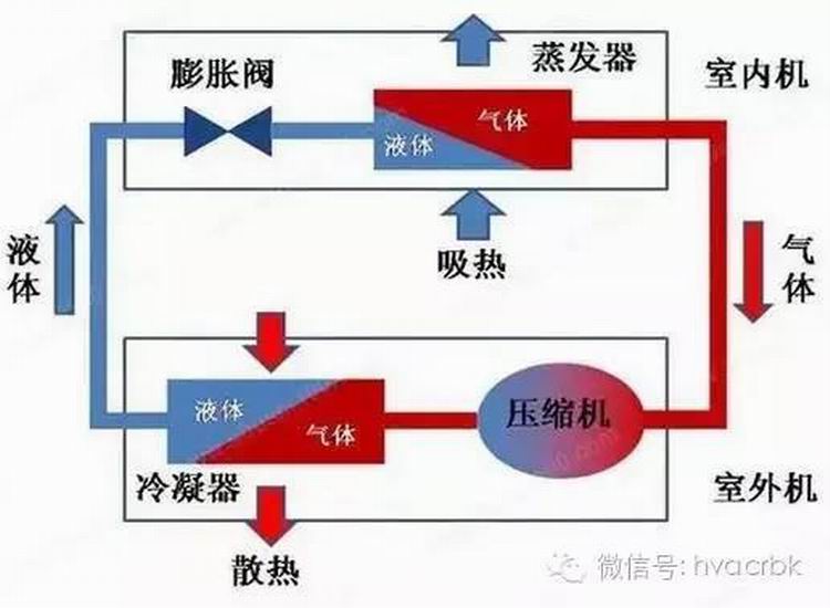 一般情況下,空調其實就是按照介質的熱脹冷縮來加以控制,室內的部分就是冷縮,室外就是熱脹了。通過壓縮機壓縮介質作功,這樣就會產生很大的熱量,即熱脹,然后再通過節流裝置一下又傳到體積大很多的空間,這樣介質的壓力一下子就低了很多,這就是冷縮吸熱,一下子就很房間的熱量交換成冷的氣體了。