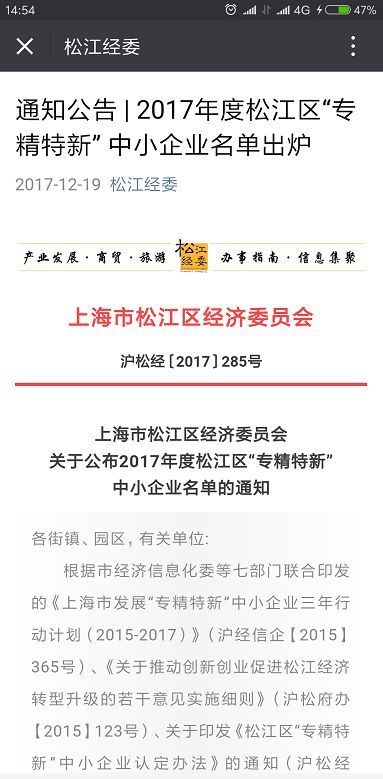 根據市經濟信息化委等七部門聯合印發的《上海市發展“專精特新”中小企業三年行動計劃(2015-2017)》(滬經信企【2015】365號)、《關于推動創新創業促進松江經濟轉型升級的若干意見實施細則》(滬松府辦【2015】123號)、關于印發《松江區“專精特新”中小企業認定辦法》的通知(滬松經【2016】189號)等文件的要求,經各街鎮、園區推薦、專家評審以及征詢相關部門意見等程序,確定上海睿通機器人自動化股份有限公司43家企業為2017年度松江區“專精特新”中小企業,現將名單公布于后。松江區“專精特新”中小企業資格有效期為兩年(截至2019年12月31日),到期后須進行資格復核。